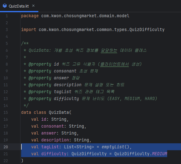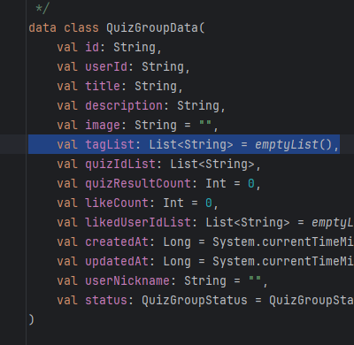QuizData, QuizGroupData 데이터 클래스에서 미리 만들어둔 필드인 'tagList, difficulty' 필드를 사용하겠습니다.