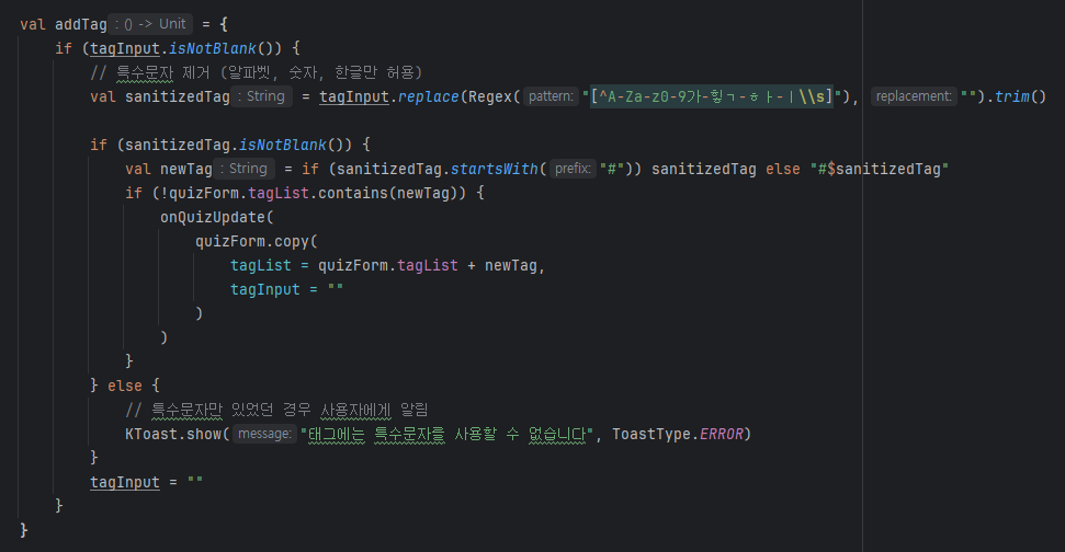 퀴즈 폼 생성 화면에서, 태그의 경우에는 특수문자가 불가능하도록 제어하겠습니다.