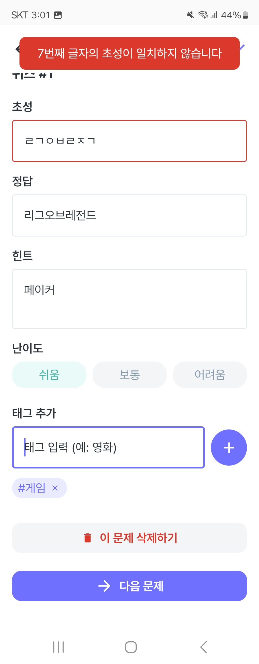 - 정답 검증: 초성과 글자 수가 같아야 함.