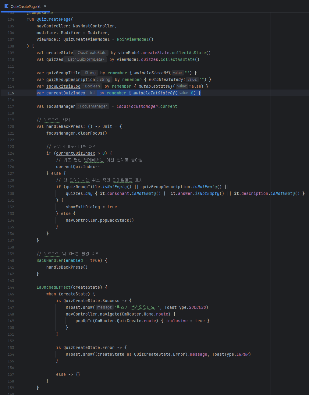 다음으로는, 퀴즈 페이지를 단계별로 진행할 수 있게 Index 변수를 하나 만들고, 뒤로가기 시에, Index가 줄어들고 페이지가 전환되도록 개발하겠습니다. 그리고 State가 Error인 경우에는 Toast를 띄우고, Success인 경우에는 홈페이지로 이동하도록 하면 될 것 같네요.
