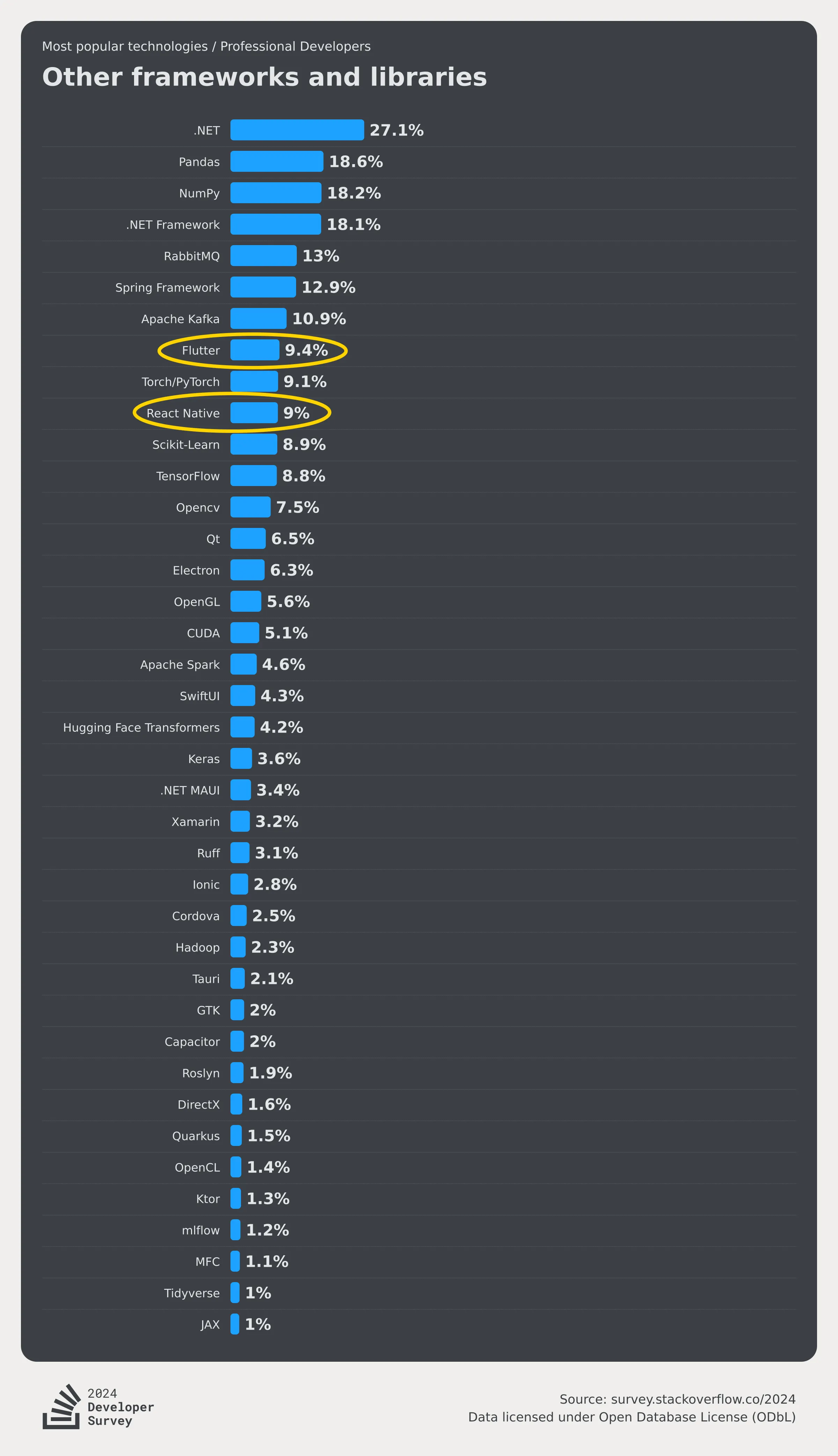 └ 스택 오버플로의 개발자 서베이 결과는 Flutter가 크로스플랫폼 시장에서 보이는 성장세를 객관적으로 보여줍니다. 2019년부터 2024년까지의 데이터를 비교해 보면, Flutter가 React Native와 같은 주요 경쟁자들과 어깨를 나란히 하는 추세가 확인됩니다. 이는 개발자 커뮤니티 내에서 Flutter의 인지도와 채택률이 꾸준히 상승하고 있음을 나타냅니다.